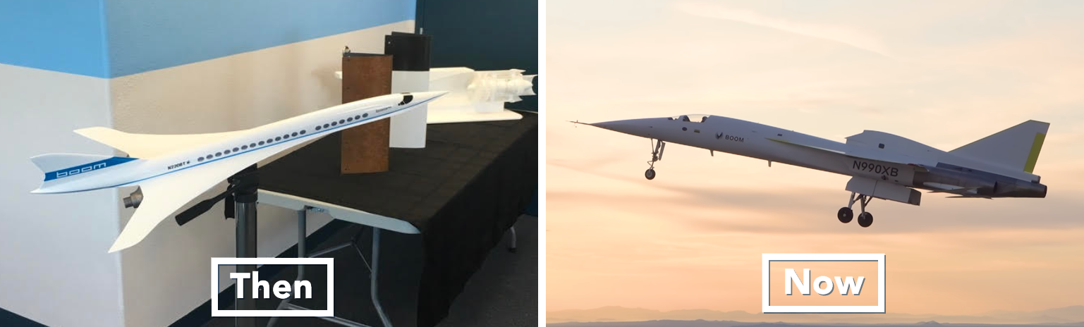 Boom Supersonic: Bringing supersonic passenger flights back to humanity. At left, the scale model they had before Demo Day; at right, their prototype jet taking its first flight in March of 2024.